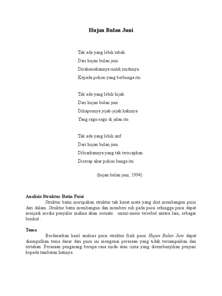 Puisi Hujan Bulan Juni. Menganalisis Struktur Fisik Puisi Hujan Bulan Juni Karya Sapardi Joko Damono Tak ada yang lebih tabah Dari hujan bulan juni Dirahasiakannya rintik rindunya Kepada pohon yang berbunga itu Tak ada yang lebih bijak Dari hujan bulan juni Dihapusnya jejak-jejak kakinya Yang ragu-ragu di jalan itu Taka ada yang lebih arif Dari hujan bulan juni. Hujan Ketika kau datang Gemuruh halus nan lantang Suaramu bagai nada-nada dan Irama yang disimfonikan.