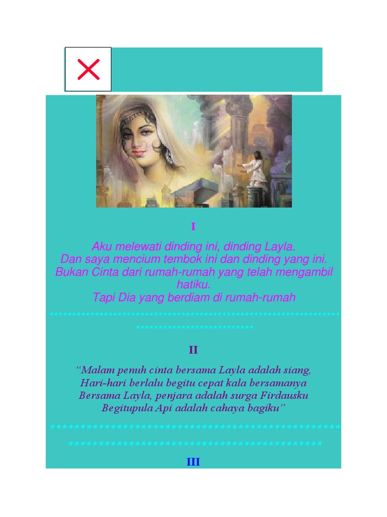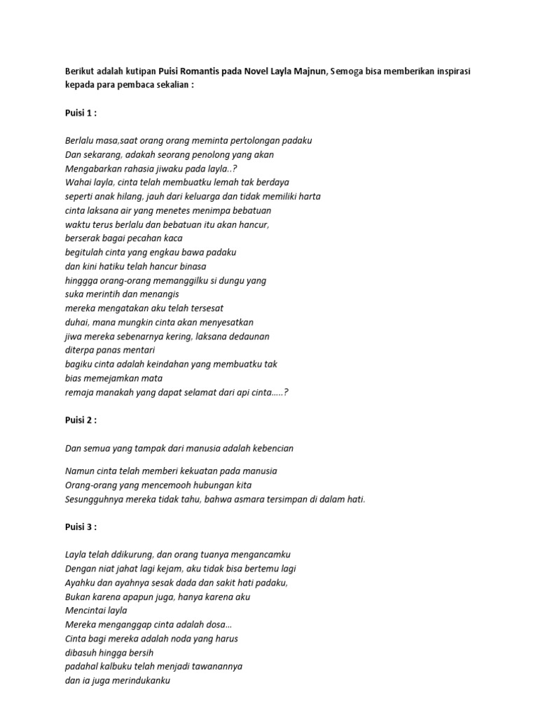 Salah satu penggalan bait dari ketiga puisi tersebut. Aug 05 2014 Jiwa dan cinta anaknya pada Layla tidak bergeming. Namun pujangga dulu tidak sebebas penulis sekarang kaidah bait yang terdiri dari rima dan iramanya tetap diperhatikan sehingga puisi tersebut bisa dinyanyikan oleh siapa pun.